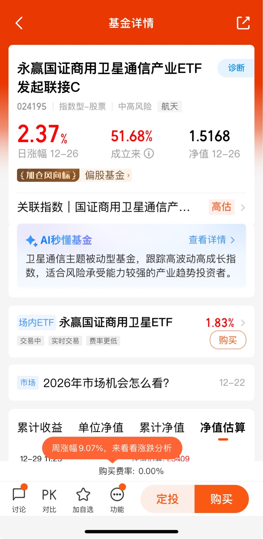 $永赢国证商用卫星通信产业ETF发起联接C$上周五收2.37%,近一周收9.07