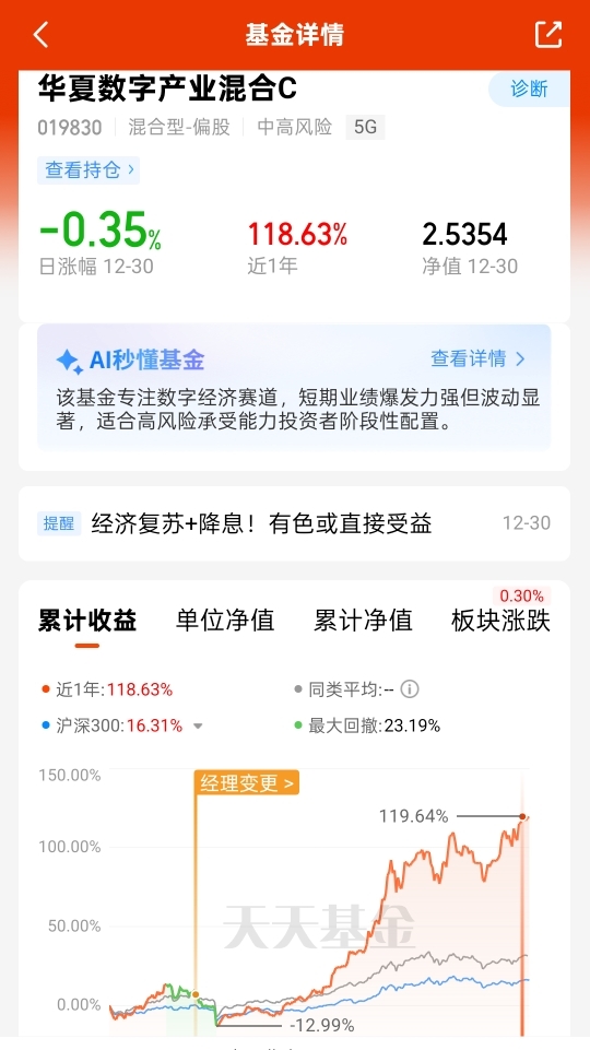 之前买基金亏过,解套后只敢买比较稳的,现在想小仓位试错华夏数字产业混合C(019830)。华夏这只算力持仓超40%,近半年最大回撤14%用15天修复了,目前累计净值2.5354,还是很诱惑我的。尤其30天赎回免费,就算亏了也不会太心疼。但还是有点怕,不知道这只基金的抗跌性怎么样?有没有和我一样解套后谨慎试错的朋友?