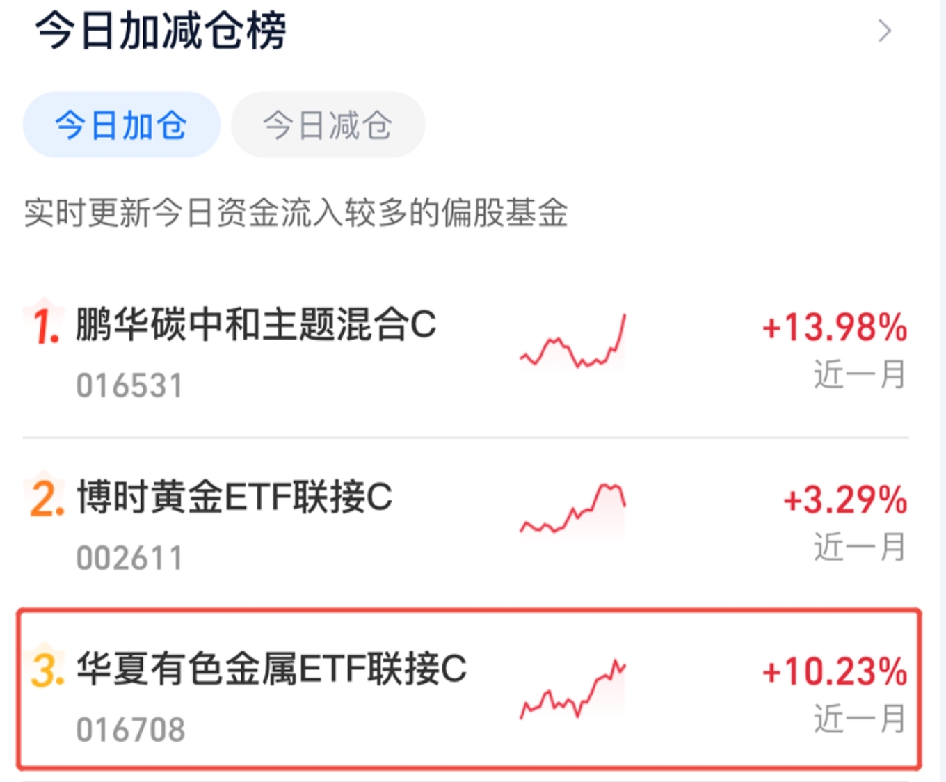 昨天涨了1.17%,今天$华夏有色金属ETF联接C$又冲起来了,加仓榜继续霸榜,