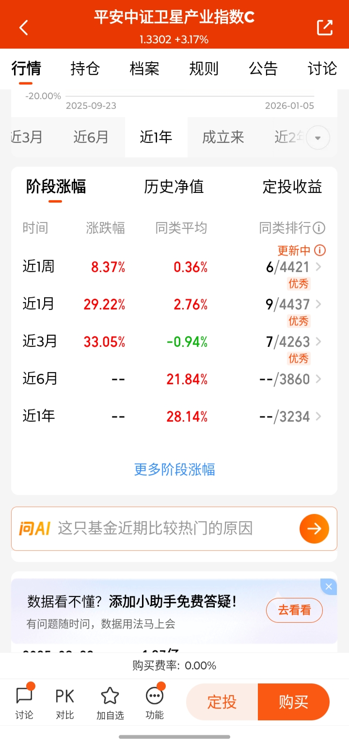 商业航天板块最近表现强势,平安中证卫星产业近一个月30%左右的收益,近一周超8%,今天涨幅3.17%业绩诱人值得信赖