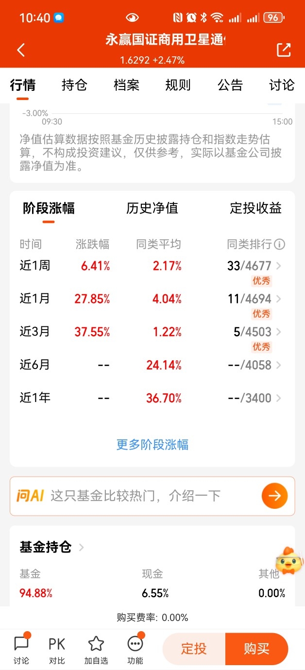 $永赢国证商用卫星通信产业ETF发起联接C$ 作为全市场首只商用卫星基,弹性优势显著,我们一起来看看业绩,近一周涨幅+6.41%,近一个月涨幅+27.85%,近三个月涨幅+37.55%,各阶段排名靠前。相比起中证卫星产业指数,卫星互联网发展方向契合度更高,趁着现在性价比高关注起来了。#13连阳!沪指再刷十年新高#