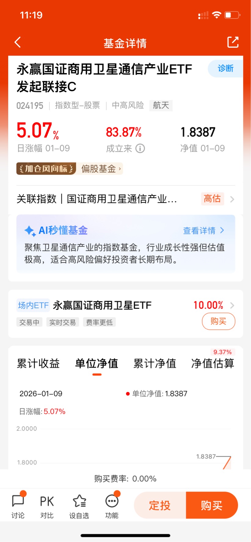 $永赢国证商用卫星通信产业ETF发起联接C$ 跟踪国证商用卫星通信产业指数,深度布局低轨卫星、通信终端等新兴领域,与5G形成互补发展,前景广阔,还是很值得关注的!上周五天四涨,近一周涨幅15.64%,近一个月涨幅42.28%,近三个月涨幅53.01%,各个阶段业绩表现都很优秀,期待接下来更好的表现了!#新增20万颗卫星申请!商业航天要爆了?#