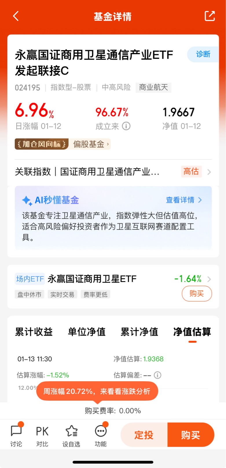 #英伟达礼来联手攻AI制药!概念股大涨# 卫星互联网板块近期表现活跃,受政策支持、技术突破和市场需求增长等因素推动,成为资本市场关注的焦点;$永赢国证商用卫星通信产业ETF发起联接C$ 昨天暴涨6.96%,连涨3天涨幅超过17个点,近一周收益20.72%,近一个月收益48.34%,近三个月收益67.42%,成立以来涨幅超过96个点,各阶段的业绩优秀,卫星互联网板块正处于快速发展阶段,政策支持、技术进步和市场需求共同推动产业向规模化、智能化、全球化方向发展,未来有望成为数字经济时代的重要基础设施,为经济社会发展提供有力支撑。