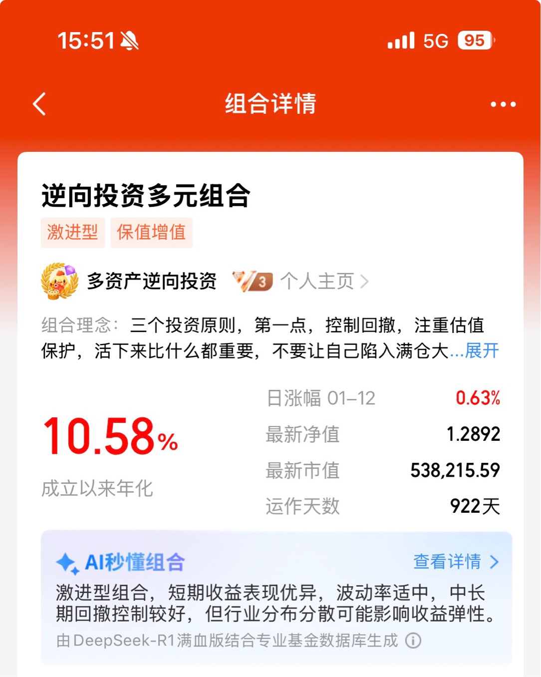逆向投资多元组合,成立922天,组合年化收益10.58%,整体波动率比较低,获得了很不错的夏普比,我们的策略简单,首先是逆向思维,权益市场亢奋时候、估值高企时,我们降低权益仓位,反之亦然,另外就是维持多元化投资、组合不仅包括权益,还有债券类基金,预计商品类持仓,主要是黄金ETF,不仅只有国内资产,还有海外权益基金,海外债券的配置。因为我们配置的是人民币份额过往一年来看,考虑到人民币升值影响,我们持仓的QDII基金比美元份额涨幅低一些,这是海外投资的一个或有损益因素。