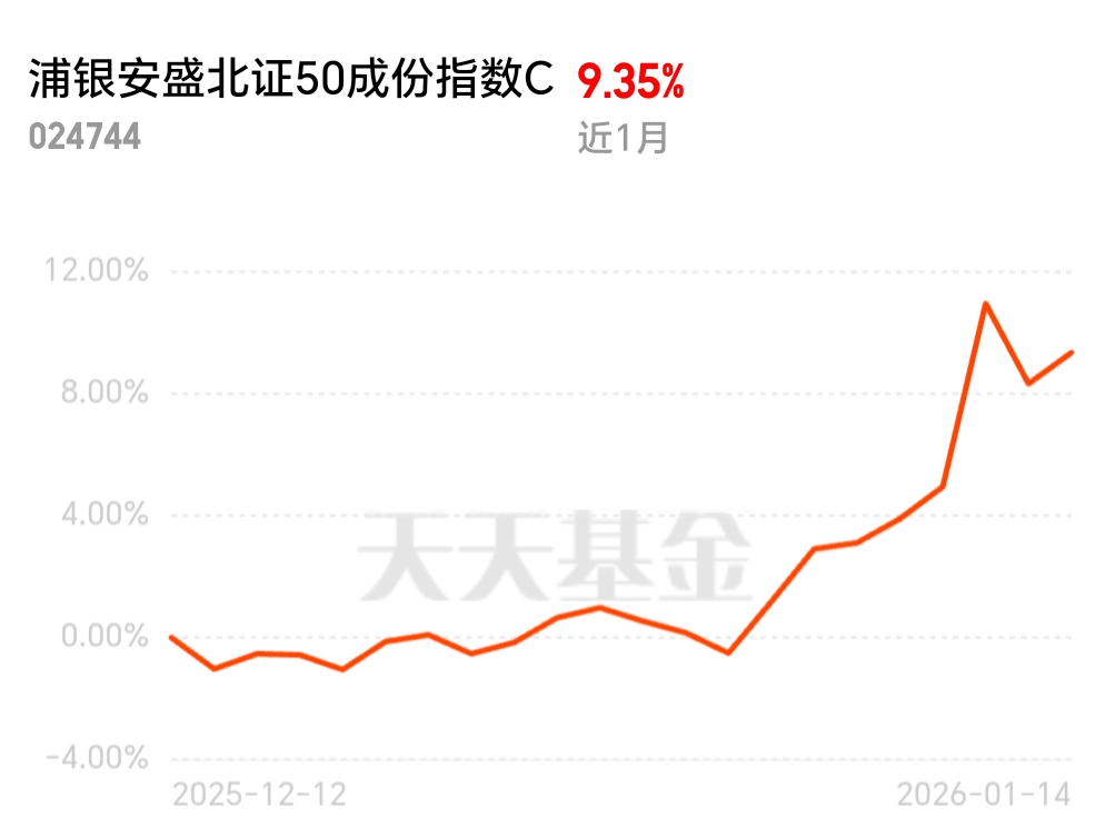 $浦银安盛北证50成份指数C$ 今日续涨!北交所30cm高弹性+专精特新扎堆,板块额度稀缺但浦银额度充足,波段操作灵活,成立即超额指数,2026上车优选