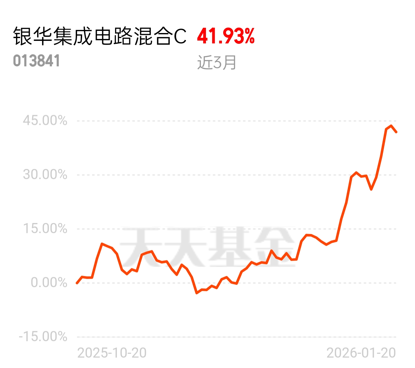 封装测试技术不断创新,集成电路产业链持续完善。银华集成电路混合 C 近 3 月 41.93% 表现稳健,近一周业绩很优秀的,今天跌了有点不爽,纠结要不要补点,长期逻辑向好可持有。$银华集成电路混合C$