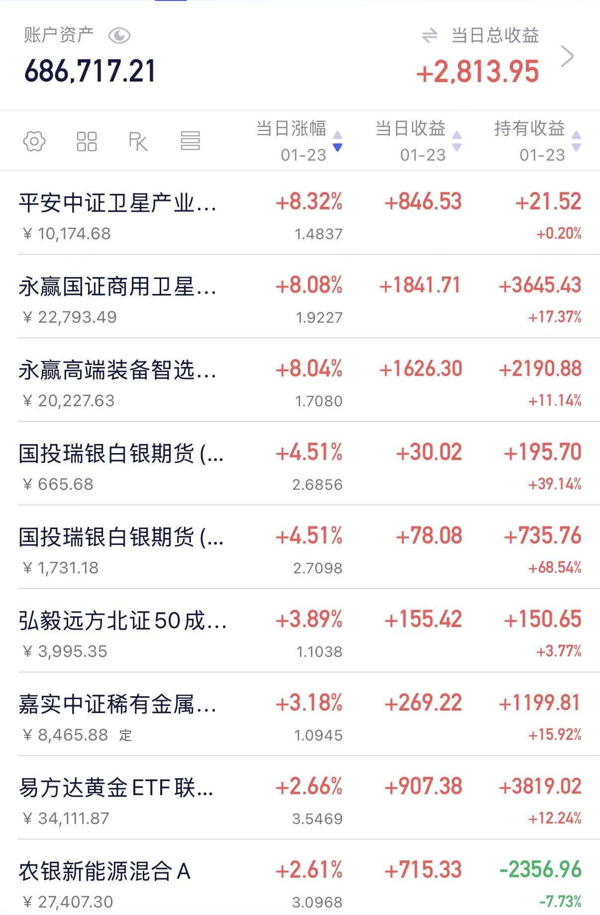 今日商业航天、卫星领域再度活跃,涨幅居前,同时白银、稀有金属、黄金拉升,小苹果的整体持仓今日也是继续盈利。我今日考虑继续加仓黄金白银、航天卫星,同时减仓稀有金属、电子信息,我考虑做一个止盈的策略。另外近期行情活跃,我考虑增加一部分宽指数基金。增加稳健类持仓比例。降低一下持仓风险。另外前期盈利较多的我今日考虑止盈一部分。具体如下。