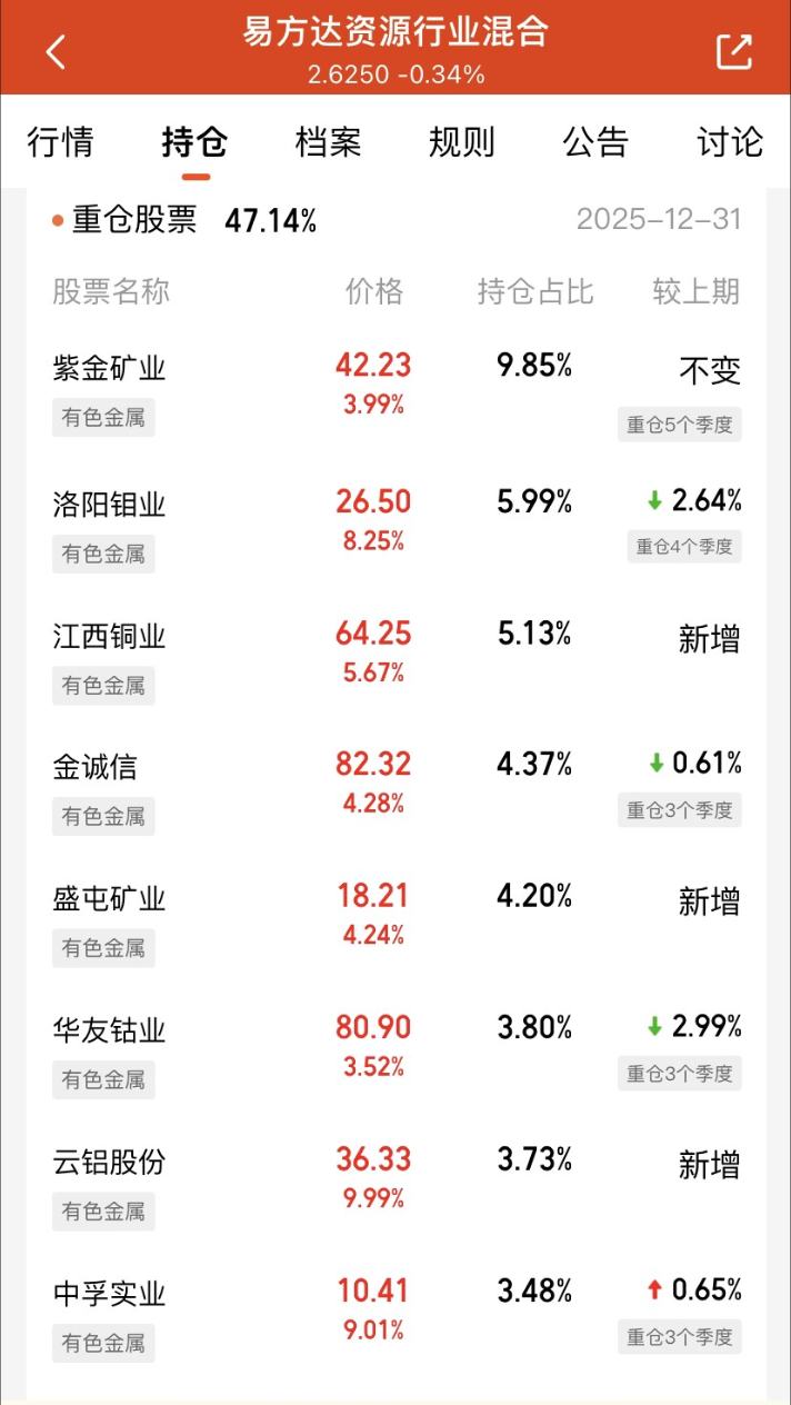 有色板块逆势扛起大旗,即便大盘情绪有波动,龙头股依旧封死涨停,走势强势看得人直呼过瘾。易方达资源行业今日估值涨 4.61%,前十大重仓股全是有色金属,持仓极度集中,近 3 个月涨幅达 35.45%,完美踩中当下主线行情,盼着能有上车的机会。