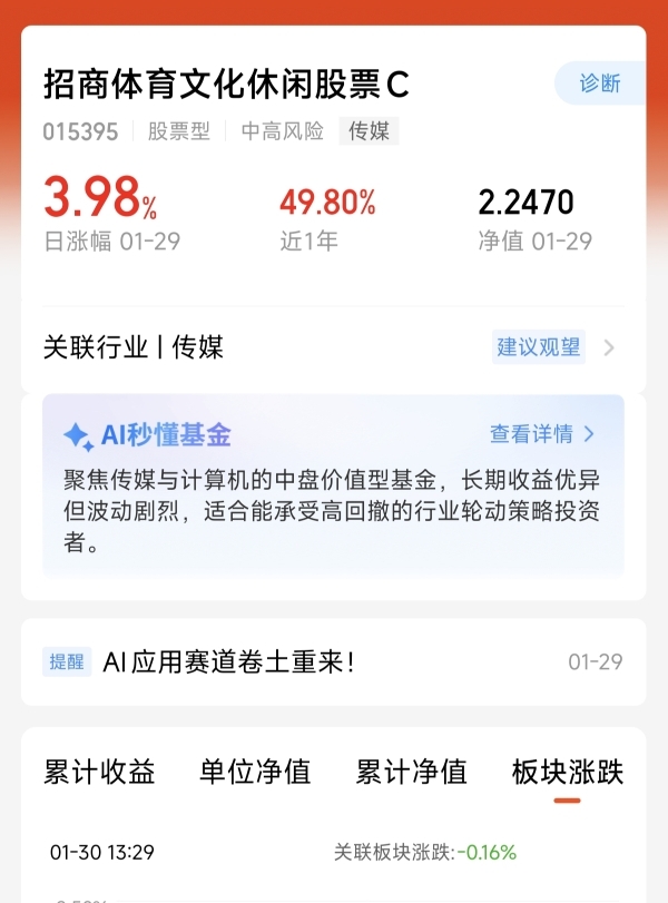 三大指数今天探底回升。创业板指目前已经上涨超一个点,科技表现的今天还是不错的。昨天反弹的AI应用方向。下午也开始企稳了。$招商体育文化休闲股票C$ 这是主动的混合基金。昨天上涨了3.98%。聚焦AI应用软件,传媒等方向。爆发力的表现好。近一年涨幅49.8%,目前看来那板块有望企稳反弹。我看好基金长期的稳定收益表现。