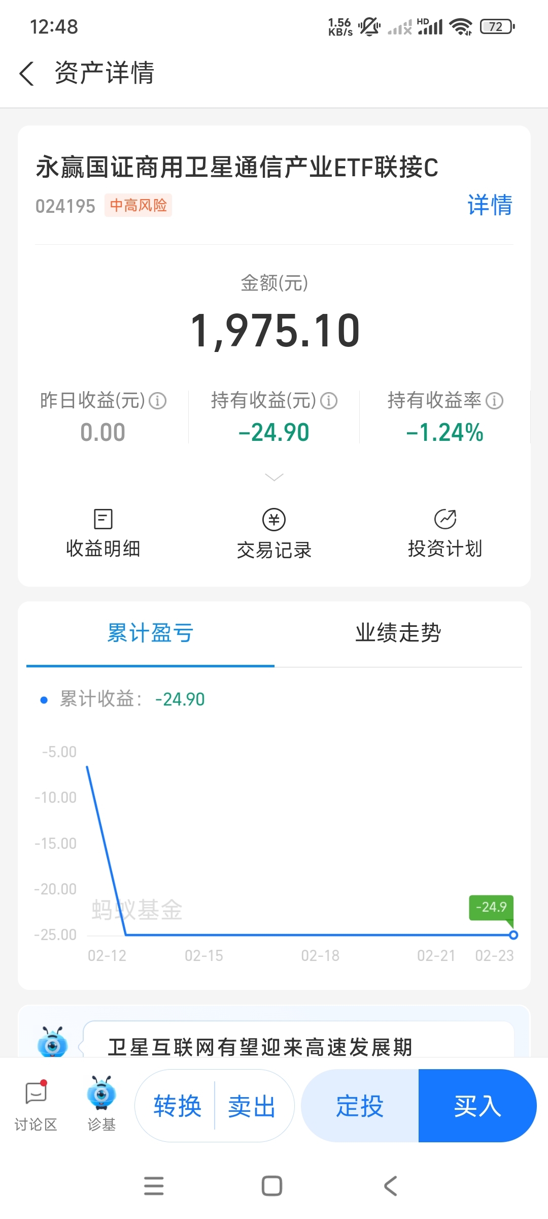 $永赢国证商用卫星通信产业ETF发起(OTCFUND|024195)$ 2.12号入的,后面经过几天观察发现阴跌还没有结束,但是应该开始跌的不那么狠了。等之后出现较大幅度下跌感觉可以试探抄点