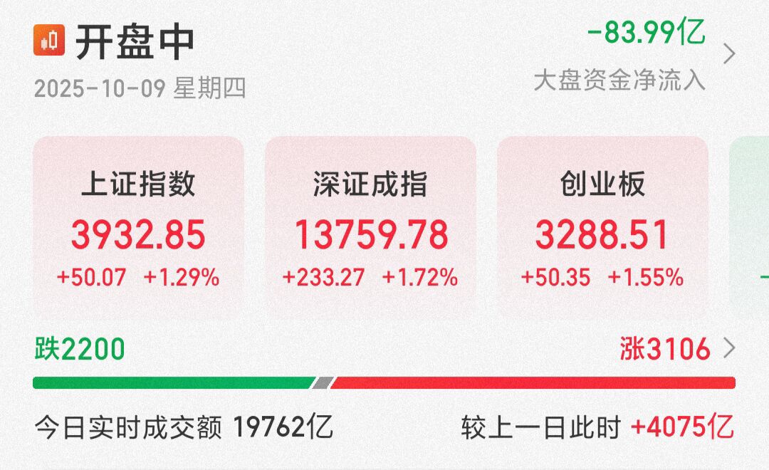 今天是国庆假期后第一个交易日,A股高开高走,上证指数强势突破3900点整数关口,刷新了2015年以来的10年新高,而创业板也是延续大涨,继续刷新2021年11月来的新高,从量能上看,两市成交大幅放量3000亿,交投非常活跃,仍然是科技领涨,赚钱效应继续。