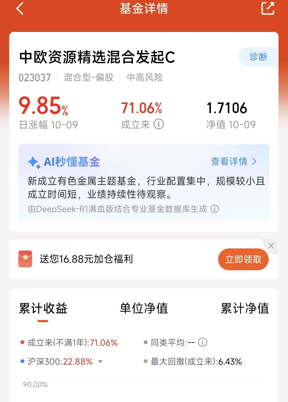 $中欧资源精选混合发起C$ 太牛了,涨幅超9.85%,接近10cm,这是一般基金能做到的么,牛市真的不买什么有色指数了,买主动管理的基金才能吃大肉,让基金经理操作让她秀多好,详情页还有红包,那就更划算了