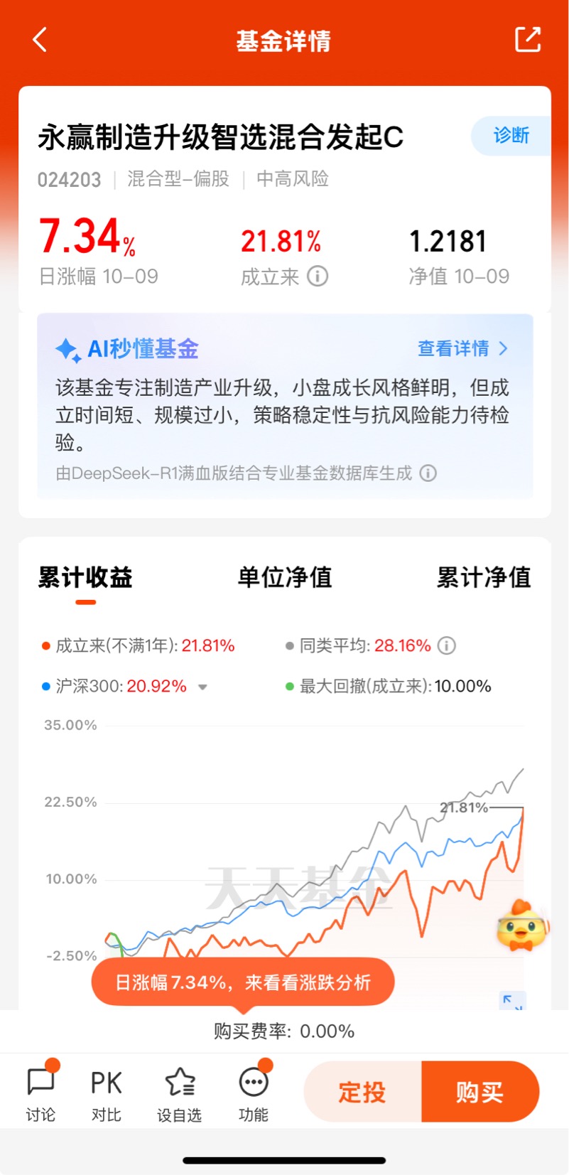 $永赢制造升级智选混合发起C$昨天大涨7.34%,近一周收益7.34%,近一个月