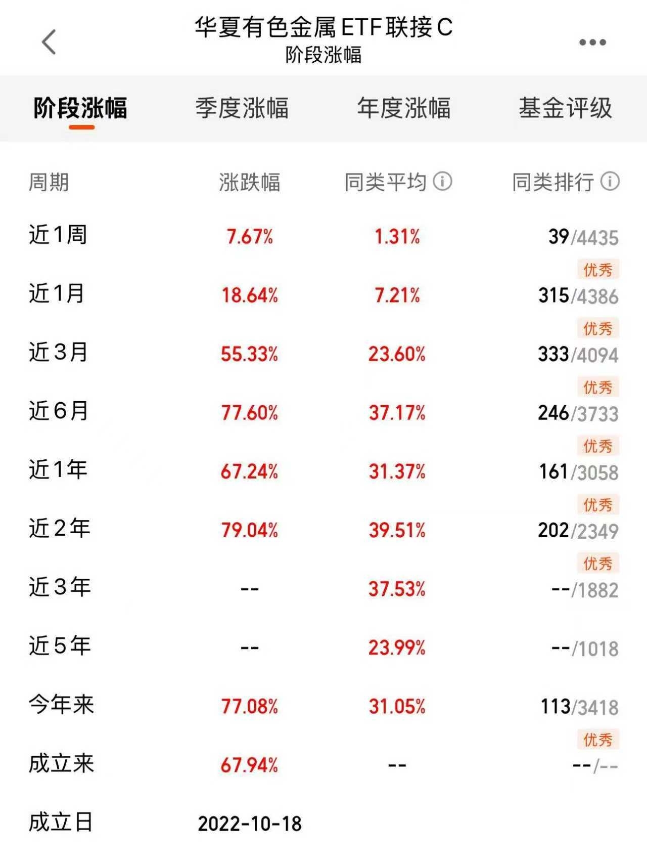 昨天大涨7.67%,近6个月收益77%+,有色的D份额有7免,费率更低,今天绝对是加仓$华夏有色金属ETF联接C$的好时机