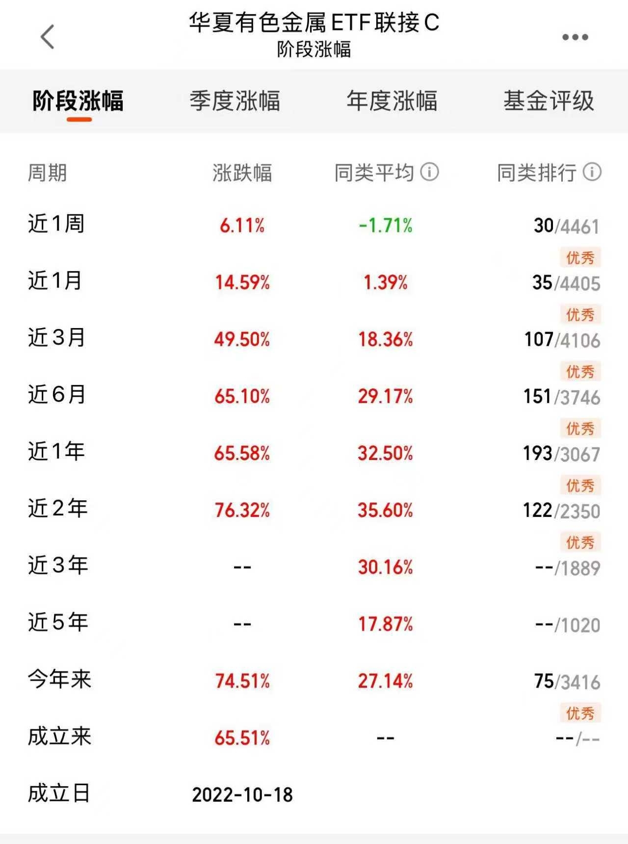 四季度的机会或将继续在有色金属方向,昨天收益0.93%,近一周收益6.11%,近一个月收益14.59%,两个时期的排名靠前,其他阶段也都优秀,上车$华夏有色金属ETF联接C$看长期了
