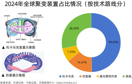 核聚变中游环节是整个产业链的核心。在2024年全球聚变装置中,托卡马克以49.69%的占比,成为最主流方案,全球最大“人造太阳”项目国际热核聚变实验堆便采用这一技术。