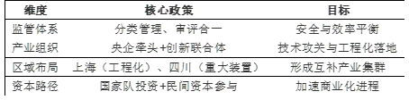 中国在可控核聚变领域的政策布局已形成多层级、多维度体系,涵盖监管框架、产业推进、地方协同及资本支持等方面,旨在加速技术攻关与商业化进程。