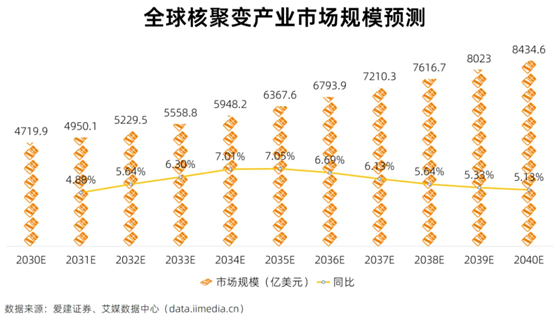 从全球市场规模来看,核聚变产业未来或将保持稳健增长态势,并且在商业化落地后更具备长期成长性。2040年,全球市场规模有望达8434.6亿美元,2030-2040年间复合增速约为6%。其中,中国市场增长势头强劲,预计到2040年规模将超500亿美元,年化复合增速为6.4%,增速略高于全球水平。