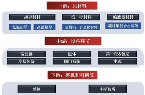 从产业链来看,可控核聚变产业链主要分为上游原材料、中游设备、下游整机三大环节。
