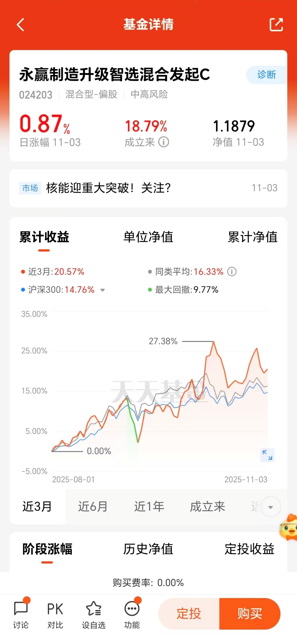 #科技小登大揭秘#最近可控核聚变领域利好频出,如果你也在看好这个方向,不妨看看$永赢制造升级智选混合发起C$ (024203)。这只产品深度布局可控核聚变产业链,业绩表现相当扎实——近一月上涨4.68%,近三个月累计涨幅达到20.57%,成立以来收益率已达18.79%,在震荡市中走出了独立的态势。