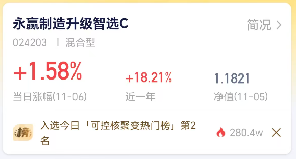 #科技小登大揭秘#有业内人士表示,可控核聚变这一行业的业绩有望持续释放,享受行业高增长的红利。而$永赢制造升级智选混合发起C$ (024203)早已通过主动管理策略提前卡位,在市场波动中收集优质筹码,而在二级市场上,可控核聚变板块亦成为不少基金经理看好的方向。