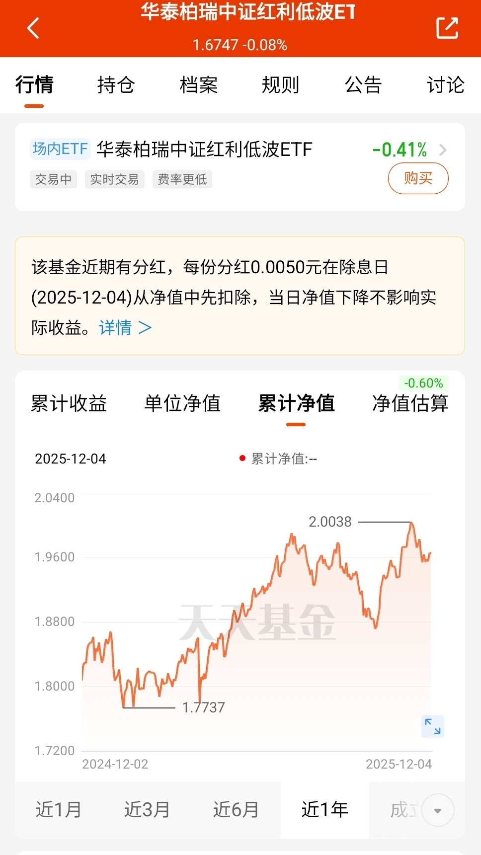 今天A股还是震荡前行,红利低波板块凭着稳当的特质逆势领优,完全符合年末红利风格占优的趋势。按日历效应,接下来到年初都是红利策略的好时机,我准备布局华泰柏瑞,它选的标的分红稳、波动小,不用为短期涨跌焦虑。