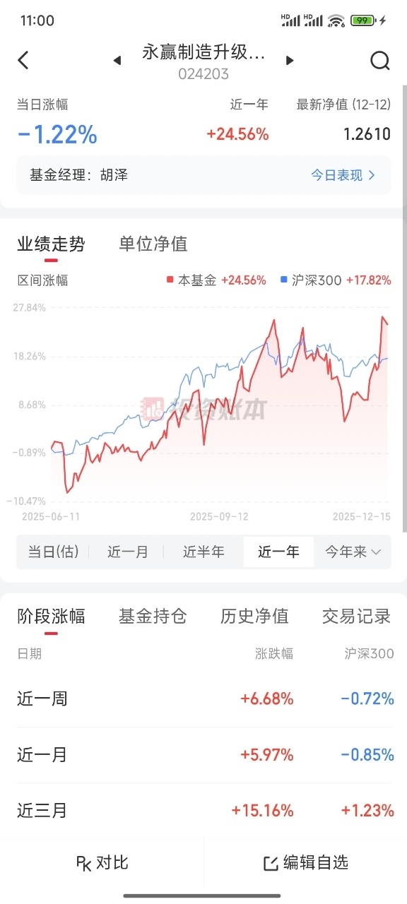 今天永赢制造升级C024203震荡回调,没上车的可以趁回调上车了,上升的趋势已经走出来了,之前一直在观望,这次回调不等了,这个回调是值得上车的,上涨趋势中的回调,蓄势待发,年底市场风格要转变,制造板块要上扬了。
