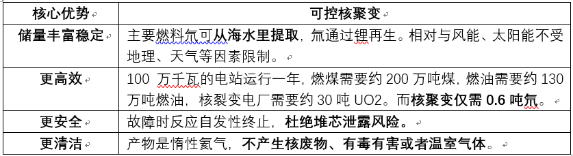 可控核聚变通过氘、氚原子核聚变释放能量,区别于传统核裂变和其他发电技术,具有储量更丰富稳定、更安全、更清洁、更高效的特性,被视为终极能源解决方案。一旦可控核聚变技术大规模商用,人类能源使用效率将迎来极大提升。