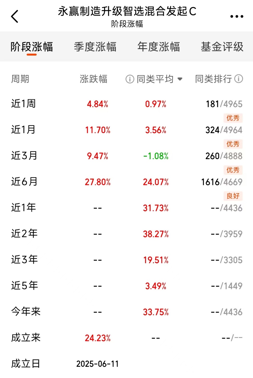 作为市场上唯一明确布局可控核聚变的主动管理基金,永赢制造升级智选混合发起C(024203)的业绩表现尤为亮眼。该基金精准捕捉上游材料与设备制造的先发优势,近1月上涨11.7%,近3月上涨9.47%(同期同类平均收益为负),近6月涨幅达27.80%,成立以来累计收益24.23%。这样的成绩并非偶然——年初以来万得核聚变概念指数涨幅已超过65%,而该基金重仓的超导材料、真空设备等领域,正是新兴产业爆发期最早受益的环节。
