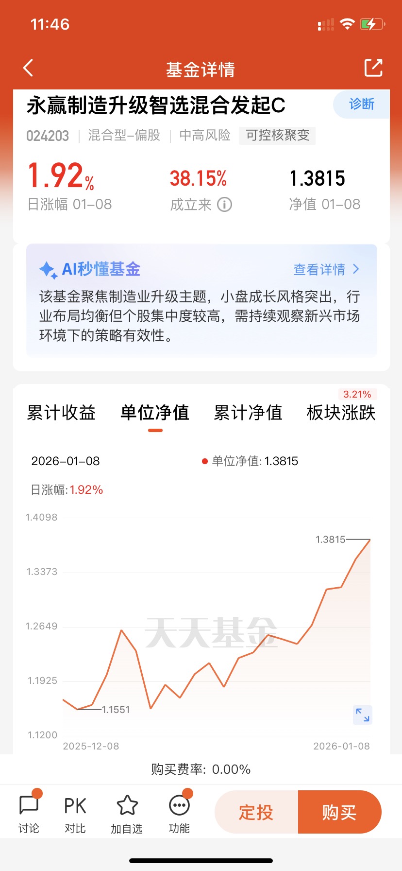 $永赢制造升级智选混合发起C$ 昨天涨了1.92%,本周四连涨啊,这状态是真不错,近一周涨了9%,近半年涨超41%,各个阶段业绩表现都很优秀,业绩弹性还是很强的抗氧化!这里是刚成立不久的一只专注制造升级主题的基金,重点挖掘先进制造、TMT领域新技术投资机会,目前规模小,板块前景广阔,值得继续关注了!#暖阳创作计划#