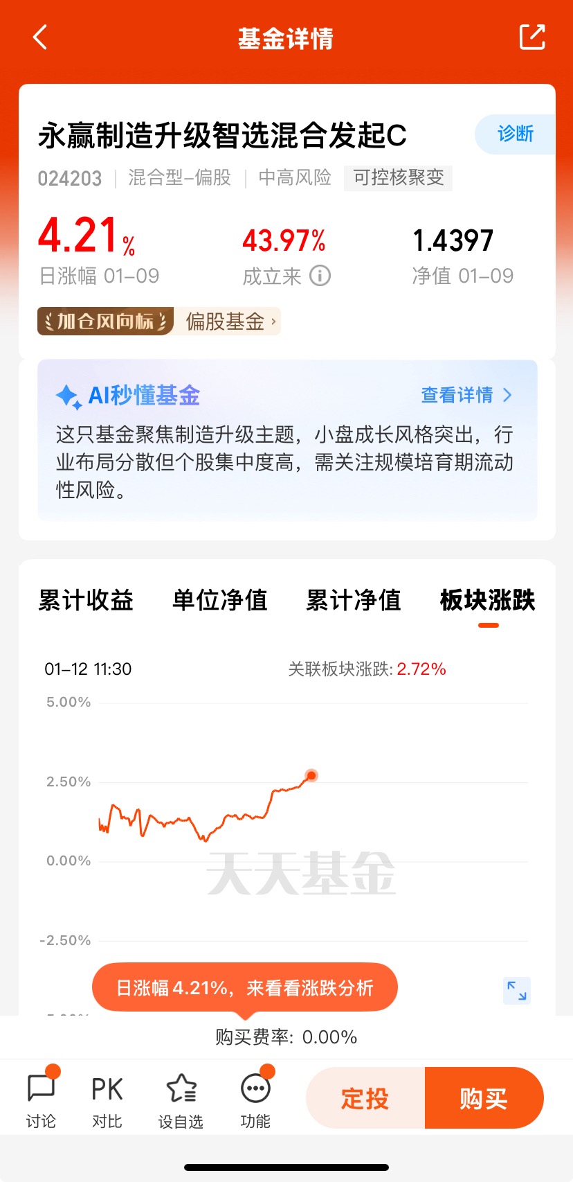 $永赢制造升级智选混合发起C$上周五大涨4.21%,已经连涨6天涨幅超过15个点