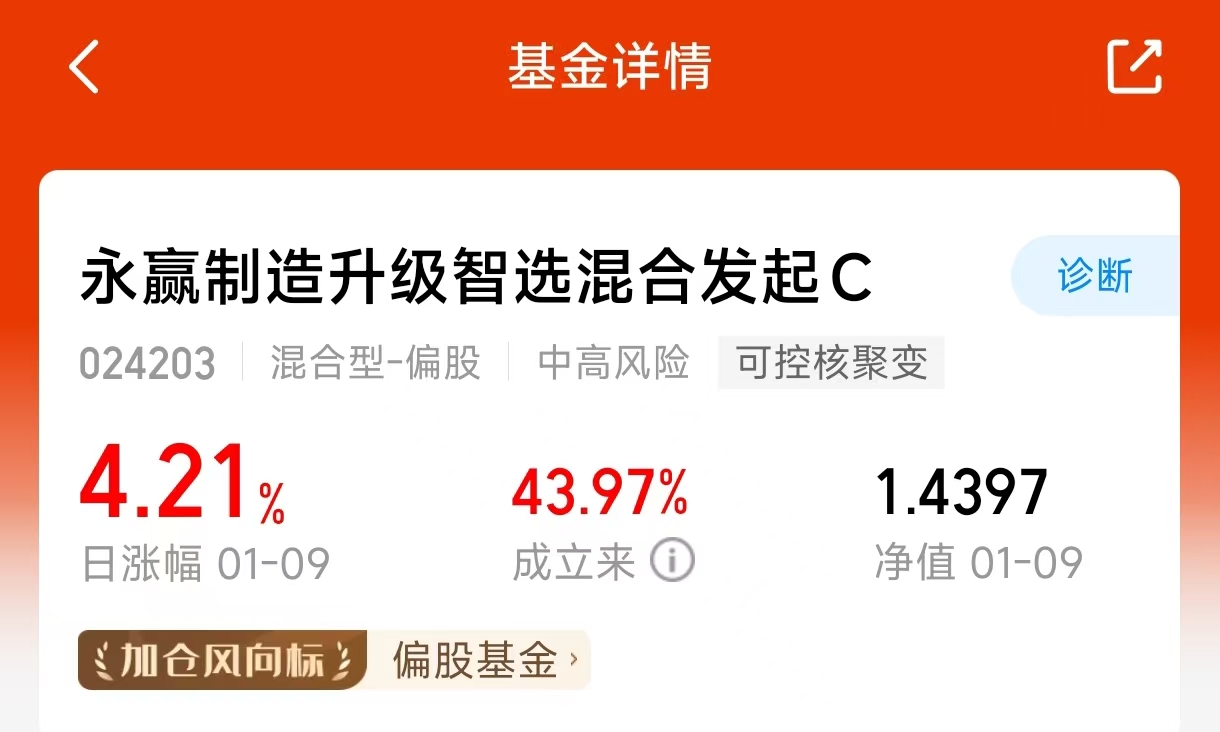 当前可控核聚变行业已迈入“工程可行性验证”阶段,各类实验堆进入设备集中采购、招标及建设的密集期。而深度聚焦产业链核心环节的$永赢制造升级智选混合发起C$ (024203),近期走出强势行情,上周五大涨4.21%。
