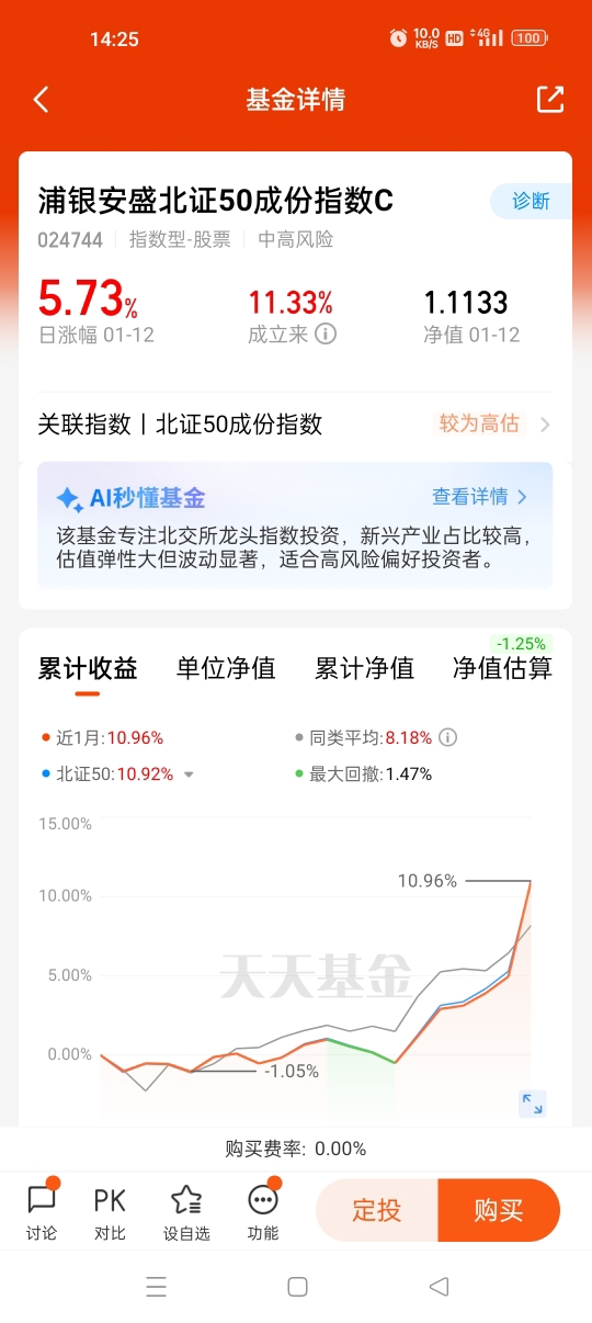 涨了那么多天$浦银安盛北证50成份指数C$ 今天回调了,但是不限额,七天免赎回费,费率低,短期操作很适合
