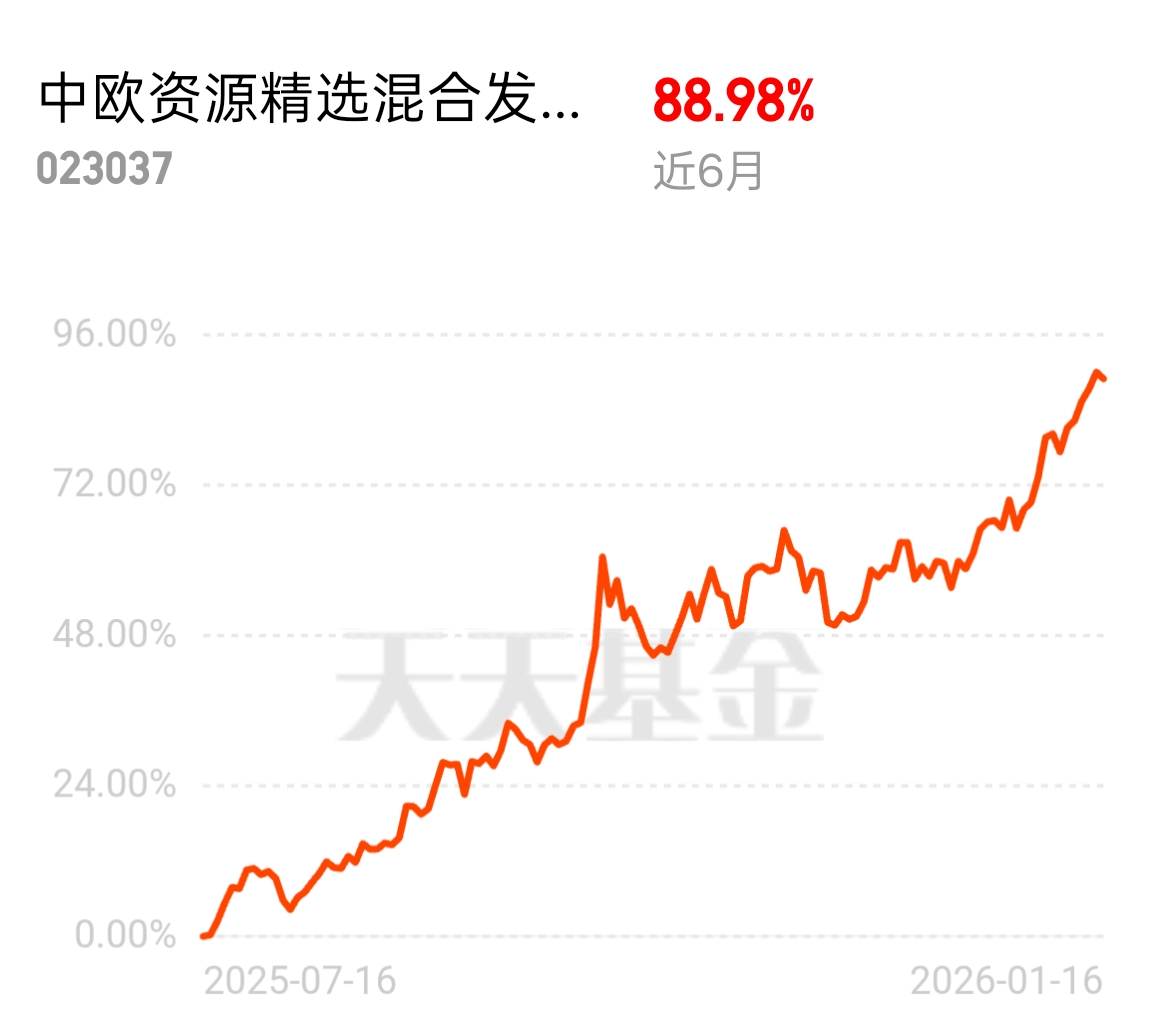 2026 年大宗商品市场分化明显,有色金属成最强赛道之一。中欧资源精选混合发起 C 近 6 月涨了 88.98%,在周期资源类基金中排名前列,铜铝产业链配置超同类,覆盖资源循环制造,把握结构性机会更专业。$中欧资源精选混合发起C$