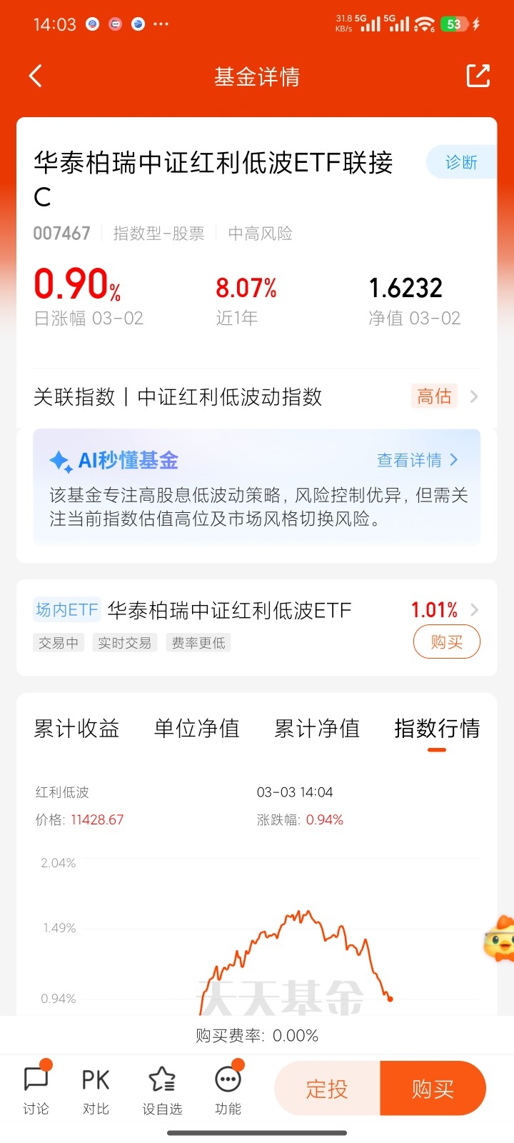 红利低波今日继续稳健上行,整体节奏舒服,不追高、不暴跌,慢慢往上走,在震荡市里优势特别突出。很多人投资最怕过山车,红利低波刚好解决这个痛点,选的都是经营稳定、持续分红的优质资产,波动小、拿得稳。近期行情也证明,这种策略在不同市场环境下都有不错的适应性,长期胜率更高。想稳稳跟上这波行情,场外投资可以选择华泰柏瑞,风格纯正、体验友好,不管是新手还是老基民,都能轻松上手,长期拿更划算。$华泰柏瑞中证红利低波ETF联接C$