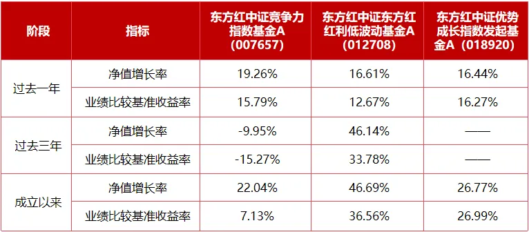 注2:东方红中证竞争力指数基金(A类)成立于2019.7.31,2020-2024年净值增长率分别为34.49%、-1.51%、-20%、-11.95%和13.65%,同期业绩比较基准收益率分别为32.08%、-3.62%、-21.05%、-13.49%和10.94%。业绩比较基准为:中证东方红竞争力指数收益率95% + 银行人民币活期存款利率(税后)5%。基金经理:徐习佳(2019.7.31起至今)、戎逸洲(2019.11.29起至今)