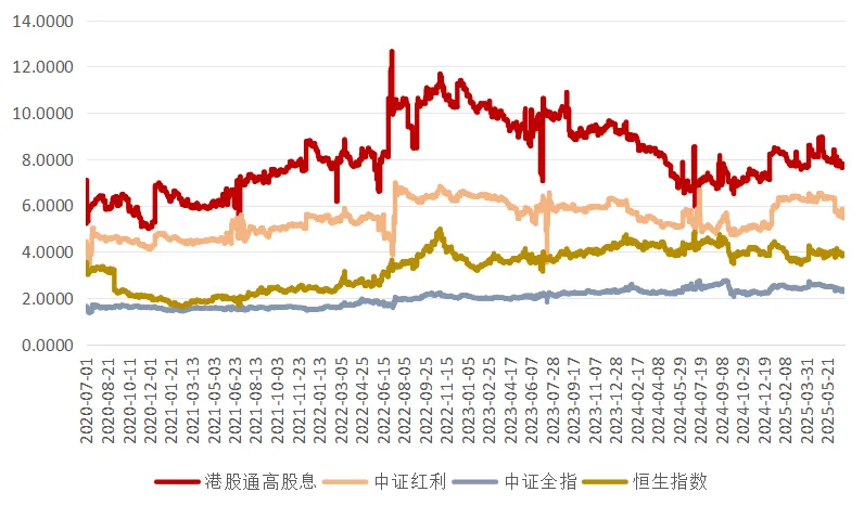 港股通高股息指数(930914/930915)的一个明显优势就是——高股息,其近五年的股息率长期超过恒生指数、中证全指的股息率,也超过了中证红利指数的股息率。在当前十年期国债收益率降至1.65%上下,货币基金7日年化收益率在1.4%左右的情况下,港股通高股息指数(930914/930915)的股息率达到7.96%,吸引力不言而喻。(数据来源:中证指数公司官网及wind,截至2025.6.30)