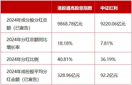 从指数成分股2024年的平均分红金额、年度分红增速、分红比例上看,相比中证红利(000922),港股通高股息指数也更胜一筹,分红比例更高,分红力度更大。