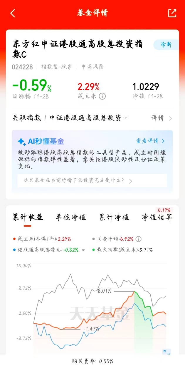 想找稳健投资的朋友可以看看东方红中证港股通高股息投资指数C,它老老实实跟踪高股息指数不费心,最近一周还涨了0.44%表现挺稳,买卖没手续费资金灵活,现在估值低考虑入手挺合适。