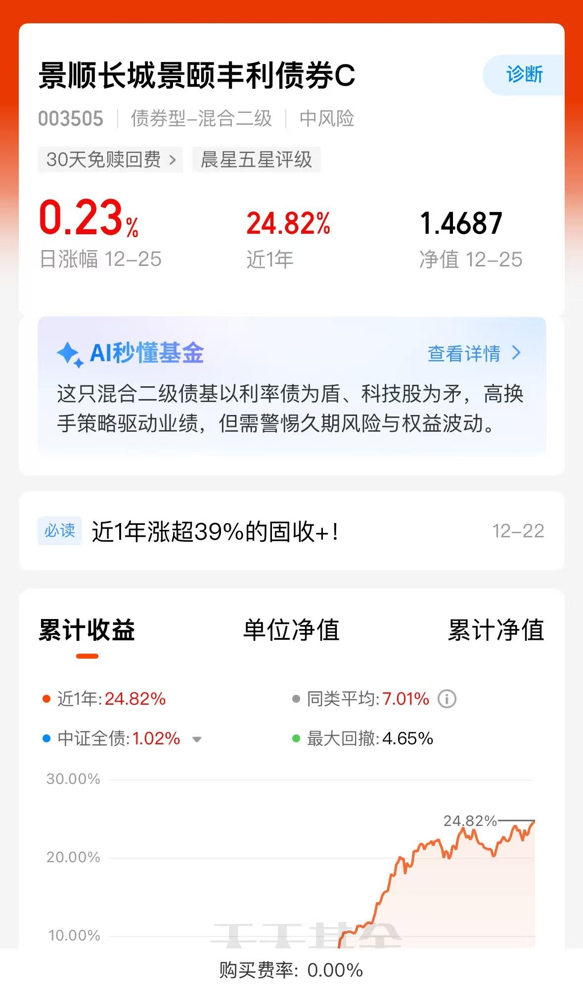 #新年观察局:2026我看好的投资赛道# 年底市场风格轮动大,可以看看景颐丰利这支含科技的混债,近一年涨幅亮眼超24%,不仅回撤小收蛋还多,实力强悍$景顺长城景颐丰利债券C$