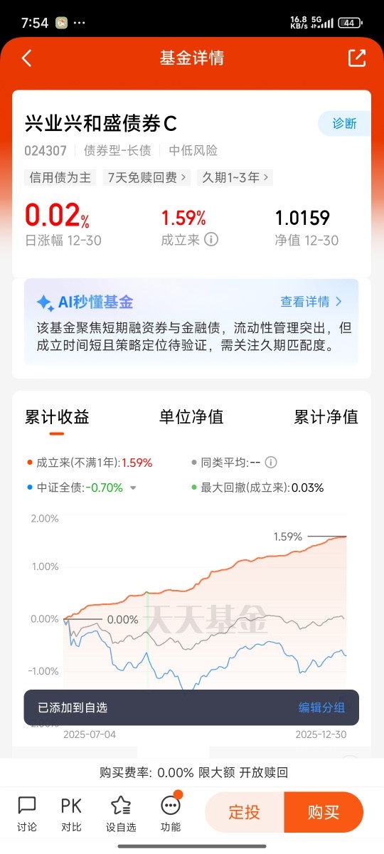 刚理财时我踩过一个大坑:买某只债基时没注意费率,赚的收益一半都用来付管理费和申购费了 但兴业兴和盛C(024307)完全解决了这个问题——前端申购费0%!不管买100还是10000,都不用花手续费,这对本金不多的新员工太友好了。
