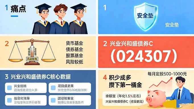 作为刚毕业半年的职场小白,每月工资除去房租和生活费,剩下的几千块钱总在“躺余额宝贬值”和“怕亏不敢投”之间纠结 试过跟风买股票型基金,亏了20%后连夜赎回;也存过定期,流动性太差急用钱时只能忍痛罚息… 直到遇见兴业兴和盛债券C(024307),才找到适合新手的“投资安全垫”——不追求暴富,但求稳稳的安心,慢慢积累第一桶金~ 今天就从真实持有体验出发,带大家拆解这只债基的核心优势、赛道前景,为啥它能成为新员工的理财首选!