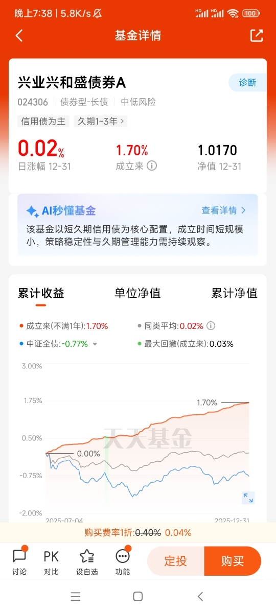 兴业兴和盛债券C是一只纯债型基金,投资策略清晰明确,不投资股票、权证等权益类资产,也不参与可转换债券的投资,投资标的主要集中在国债、金融债、企业债等信用等级较高的债券品种上。这样的投资方向,从源头上规避了权益市场波动带来的风险,产品净值的稳定性更强,完美契合投资者对安全垫资产“稳”字当头的需求。