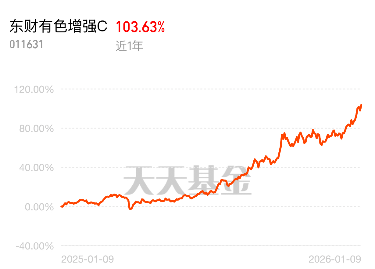 国际金价创历史新高,伦铜逼近万元大关,有色全产业链都在涨!东财有色增强 C 近 1 年 103.63%,继续稳步上升,回撤也不大,真是债基 plus,稳健选手闭眼冲~$东财有色增强C$