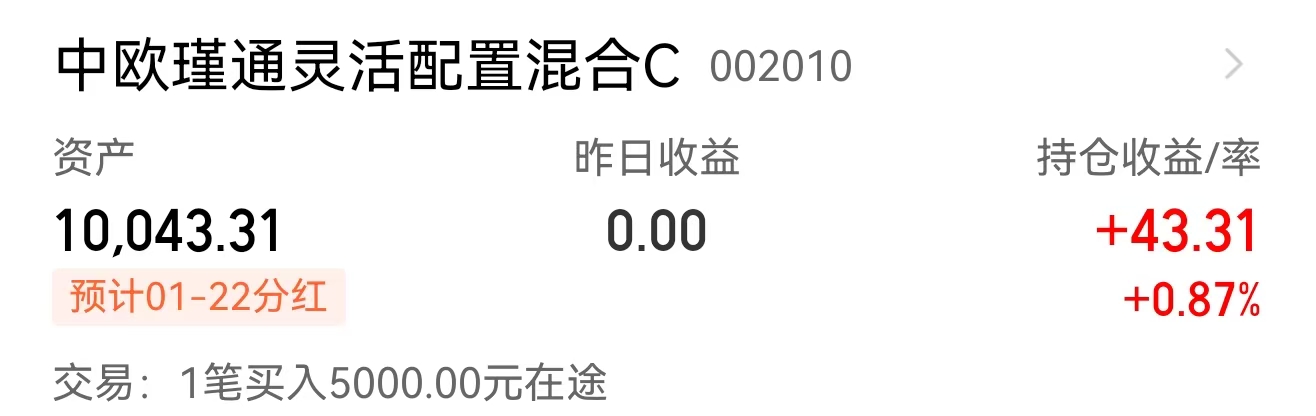(1)此前小涵建仓的$中欧瑾通灵活配置混合C(OTCFUND|002010)$体验感还不错,可以说非常稳定,完全是当底仓在持有,而近期受监管影响,权益市场短期内或会震荡反复,那么这类对风控比较严格的基金是比较适合持有的,整体表现属于不操心安心持有的一类,从持仓来看,当前中欧瑾通主要以高等级信用债为主,票息收益较厚,个股仓位保持在20%以内,标准的8+2配置,个股分散于新能源、周期、电力等多个领域,但行业配置均低于1%,所以近一年回撤非常低,仅1.52%,小于大多数纯长债的弹性,而近一年收益率却高达7.05%,近3年最大回撤2.79%,也是排同类水平前4%,下行风险控制能力非常强,这类稳健性混债,相当于当纯长债去拿了,在市场波动背景下,回撤幅度也很小,且修复能力强,当前小涵仅持有十几个交易日,收益率达0.87%,非常舒服的走势,今天打算补点仓位。
