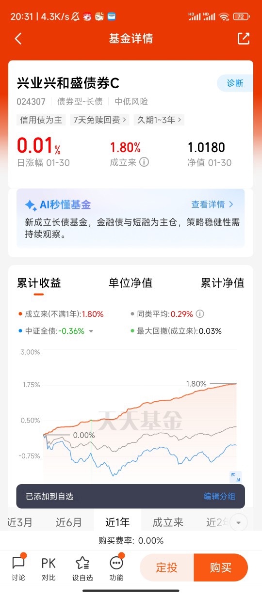 #开年投资顺# #白银一度跌超8% 贵金属巨震是何信号?# 选择投资安全垫,可优先选中低风险、以稳健收益为目标的产品,重点关注基金的风险控制策略、资产配置逻辑和管理人能力。兴业兴和盛作为长期纯债型基金,是适配的安全垫选项:其一,它将80%以上资产投向债券,搭配国债期货、信用衍生品等对冲策略,严格控制波动,同时保留5%以上的高流动性资产应对赎回需求;其二,基金经理刘禹含拥有8年以上固收管理经验,同类产品长期收益排名靠前,投资风格偏稳健;其三,0.2%的低管理费率、0.04%起的申购费(A类)降低了持有成本,C类还免申购费,适合不同持有周期的投资者。