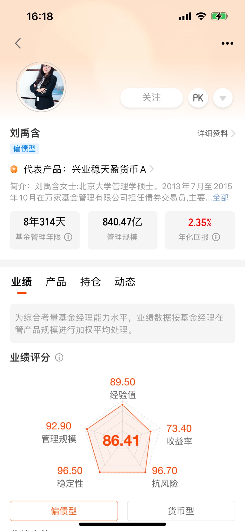首先,从基金经理来看,兴业兴和盛债券C的基金经理是刘禹含,她有着8年多的基金管理经验,管理规模超过840亿,年化回报2.35%。她擅长信用债和短债的投资,尤其是在信用风险识别和利率走势判断方面有着独到的见解。她管理的产品稳定性和抗风险能力都很强,比如她管理的兴业稳天盈货币A,近1年的收益率是1.46%,任职回报是23.49%,表现非常稳健。而且她的经验值高达89.50,稳定性和抗风险能力评分都在95分以上,是一位非常靠谱的基金经理。