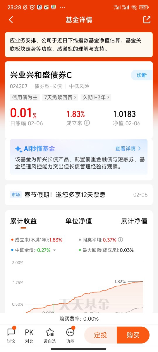 今年我打算持债过年,选的是兴业兴和盛债券C(024307)。最近市场震荡挺明显,股票、权益类基金波动大,心里不踏实,先把防守做好更重要。