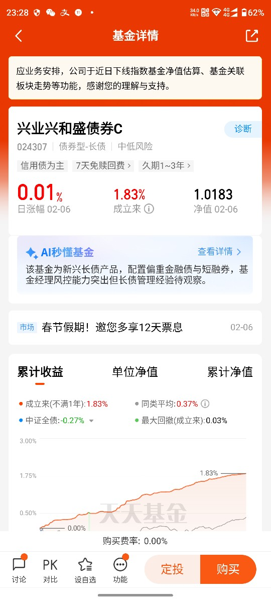 我持有的是兴业兴和盛债券C,这只纯债基金不投股票,风格稳健、波动小,适合追求安稳的朋友。C类费率友好,短期持有也划算,假期持有不踏空,节后进退都灵活。