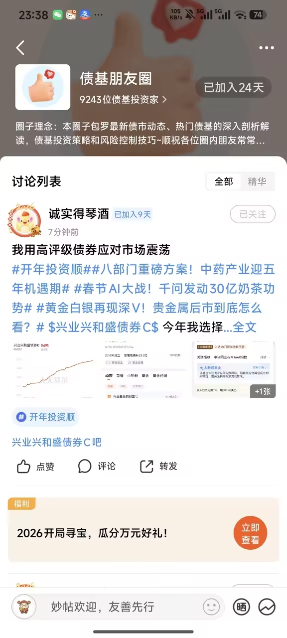 新一年投资,先稳后进。拿着兴业兴和盛债券C过年,心里踏实,也祝大家开年投资顺、收益稳、假期安心!$兴业兴和盛债券C$